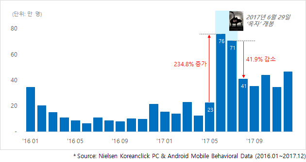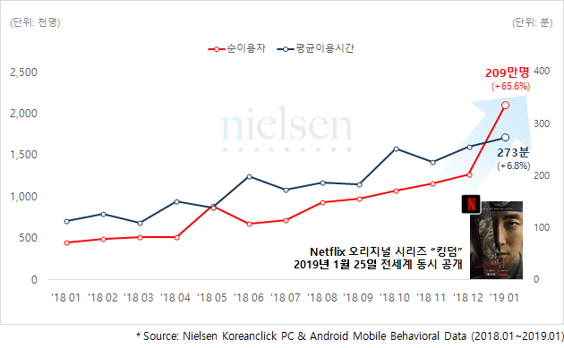 2019년 1월 25일 Netflix를 통해 전세계 동시에 개봉된 ‘킹덤’은 Netflix가 제작한 최초의 한국 오리지널 시리즈로 일반적인 드라마처럼 지상파 방송사, 케이블 또는 종합편성TV를 통해 방송되지 않고 오직 Netflix에서만 방송됨에도 불구하고, ‘시그널’의 김은희 작가와 ‘터널’의 김성훈 감독, 주지훈, 류승룡, 배두나 등 탄탄한 배우진으로 기획 단계에서부터 국내에서 큰 화제가 되었던 작품입니다. 실제로 ‘킹덤’이 개봉한 지난 1월 국내 PC와 안드로이드 스마트폰 사용자의 ‘Netflix’ 서비스 추정 순이용자가 전월 대비 65.6% 대폭 늘어나 단숨에 200만을 넘어섰고, 평균이용시간도 273분으로 전월 대비 6.8% 증가하며 ‘킹덤’ 효과가 입증되었습니다. 또한, 조사 범위에서 제외된 고정형 TV와 아이폰 사용자를 포함할 경우 Netflix의 증가 효과는 더 컸을 것으로 보입니다.
