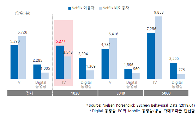 Netflix 이용자들은 비이용자 대비 평균적으로 Digital 동영상 소비가 2배 이상 많아 Digital 영상에 대한 관심이 높은 것으로 확인되지만, 영상 콘텐츠를 소비할 수 있는 또 다른 디바이스인 TV에서의 영상 소비도 비이용자 대비 못지 않게 많을 뿐 아니라 절대 소비량으로 따지면 Digital보다 TV를 통한 영상물 소비가 2배 이상 더 많아 국내 방송 프로그램에 대한 관심도 많은 것으로 확인됩니다. 특히 앞서 살펴본 바와 같이 Netflix 이용자 중 가장 큰 많은 이용자 및 활동성 비중을 차지하는 1020 세대는 다른 세대와는 달리 Netflix 이용자가 오히려 비이용자보다 더 TV 소비가 1.5배 가량 많아, 이 세대는 특히나 TV 방송 프로그램에 대한 니즈가 높은 것을 확인할 수 있습니다.