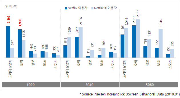 1020세대는 Netflix 이용자가 비이용자 대비, 3040과 5060세대는 비이용자가 이용자 대비모든 TV 프로그램 장르의 소비가 많은 상반되는 현상이 확인되었습니다. 하지만 공통적으로 모든 연령대와 그룹에서 ‘드라마&영화’와 ‘오락’ 장르의 프로그램 소비를 선호하는 것으로 나타났는데, 특히 Netflix 핵심 이용자층인 1020세대는 Netflix 이용자가 비이용자 대비 ‘드라마&영화’와 ‘오락’ 장르의 프로그램 소비량이 압도적으로 많은 것으로 조사되었습니다. 그 중에서도 Netflix 1020세대는 ‘드라마&영화’를 동일 세대 비이용자 대비 3배이상 많이 시청할 뿐 아니라 모든 그룹을 통틀어 가장 많은 ‘드라마&영화’를 시청하는 그룹인 것으로 나타나, 해당 연령층의 국내 방송 콘텐츠에 대한 소비 니즈 충족이 향후 지속적인 서비스 성장을 위한 방안이 될 것으로 판단됩니다.