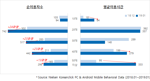‘킹덤’ 효과로 Netflix 서비스는 다양한 연령층으로 이용자 저변이 확대되는 긍정적인 성과를 거두었습니다. Netflix의 기존 핵심 이용자층인 20대가 24만명 늘어나 가장 많은 이용자가 유입되었으나, 그 외 30대와 40대는 23만, 50 대 이상 고연령층도 13만명 늘어나 다양한 연령대로의 이용자들이 신규로 유입되었습니다. 그 중 40대와 50대 이상 이용자들은 평균 이용시간도 크게 증가해, 기존 중장년층 Netflix 이용자들의 활동성도 개선된 것을 확인할 수 있습니다.