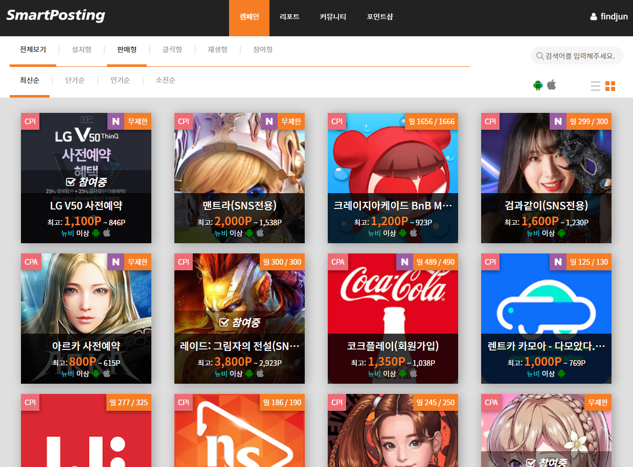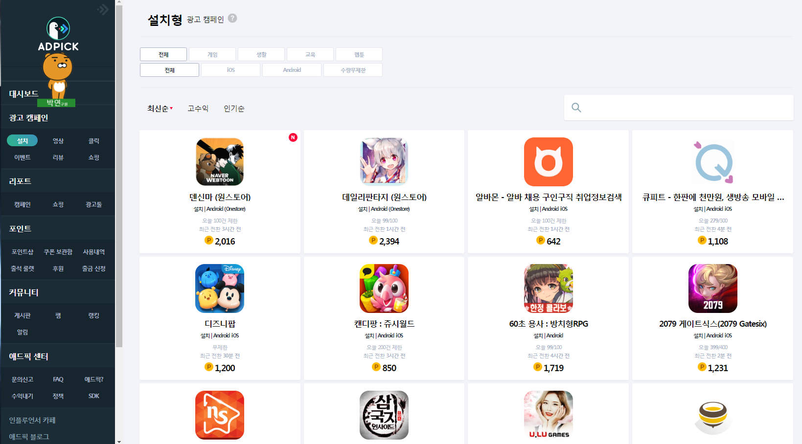 · 특징 : 설치,영상,클릭,이벤트,리뷰,쇼핑 등 다양한 상품군으로 구성되어 종류가 많다.