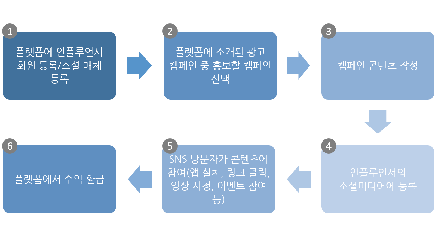 요즘에는 "성과형 인플루언서, 셀럽형 인플루언서로 분류하여" 표현하기도 합니다. 성과형 인플루언서 프로세스를 보시면 다음과 같습니다.