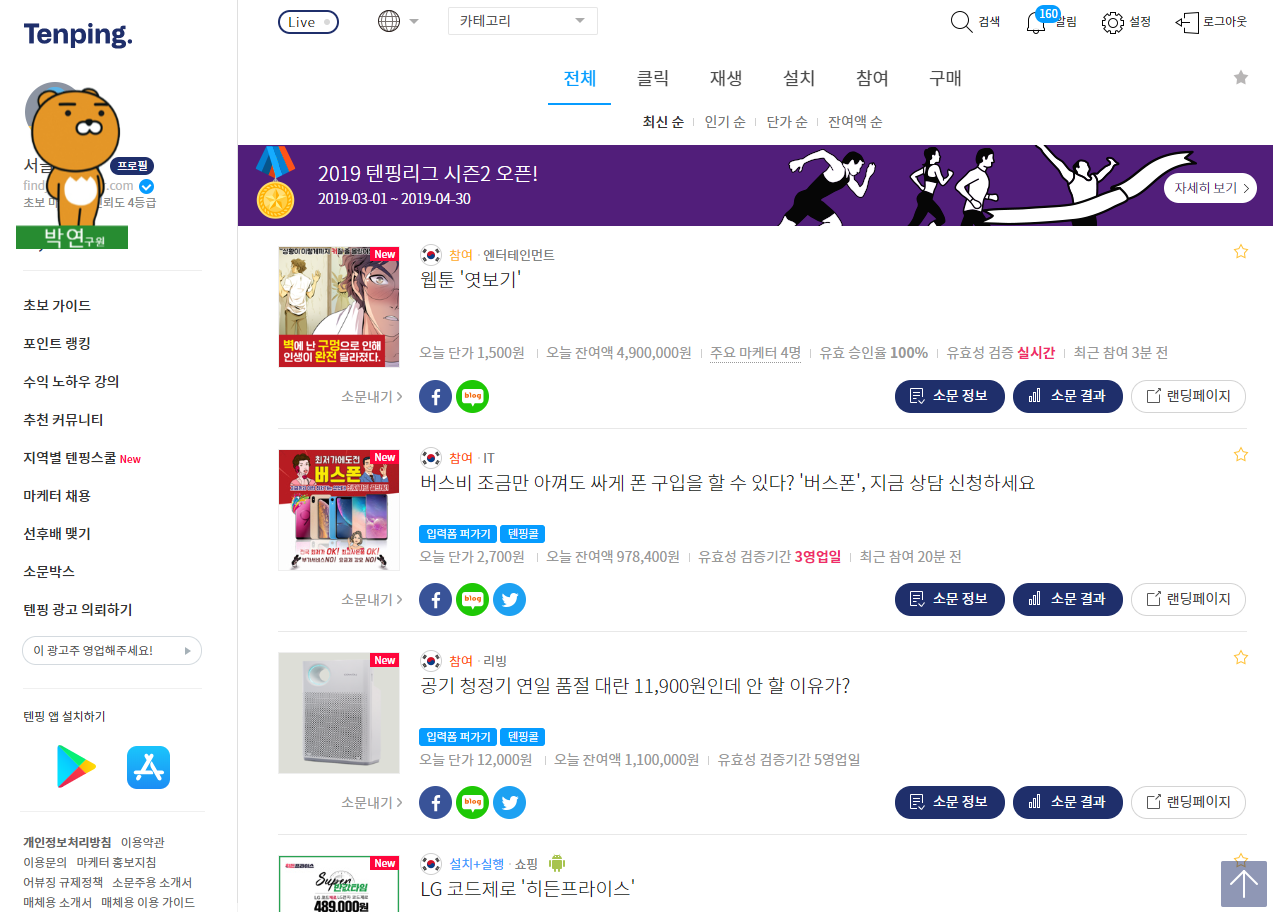 소문내고 현금 포인트를 받는 국민부업 앱 '텐핑'