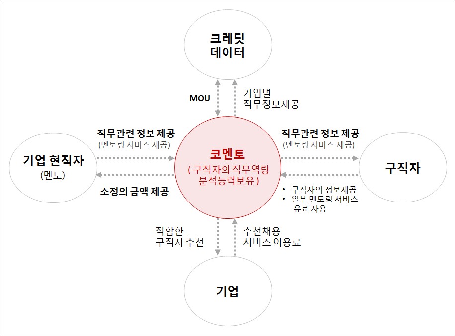 코멘토는 기업에 근무하고 있는 현직자와 구직자, 그리고 구인을 하는 기업을 다방면에서 연결시켜주는 서비스를 제공한다. 구직자들이 직장을 구하는 과정에서 얻을 수 있는 정보는 한정적이다. 기업에 대한 대략적인 정보는 알 수 있지만, 가장 중요한 정보인 근무 환경이나 실제로 이루어지는 업무 내용, 또 그 과정에서 발생하는 고충이나 필요한 직무 능력과 같은 구체적인 사실들을 알 수가 없다. 이는 오로지 실제로 근무하고 있는 현직자만이 제공할 수 잇는 정보이다. 실질적으로 유용한 정보를 통해 구직자들이 좋은 기회를 얻기를 바라면서 코멘토는 현직자와 구직자를 멘토와 멘티라는 형태로 묶어서 구직자가 현직자에게 필요한 정보를 얻고 고민을 상담할 수 잇는 멘토링 서비스를 제공한다. 이 서비스는 구직자와 현직자 간 정보의 비대칭성을 해소하는 취업 정보 매칭 플랫폼의 형태를 지닌다.
