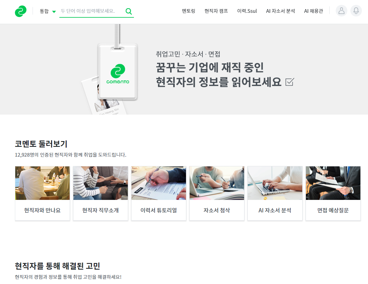 코멘토는 구직자들에게 기회와 정보를 제공하려는 취지에서 설립되었다. 구직자가 원하는 직업군 및 직장에 대한 정보 취득은 물론이고, 구직 활동이 가장 활발한 시즌에는 자기소개서 관련 피드백을 요청할 수도 있어 구직자가 취업과 관련하여 가능한 정보를 최대한 얻을 수 있도록 멘토링 서비스를 제공한다. 멘토링 서비스를 이용하면 구직자가 남긴 여러 가지 기록들을 분석하여 구직자의 기본적인 조건을 비록해 다양한 측면에서 구직자의 역량을 파악할 수 있다. 코멘토는 단순히 구직자의 멘토링과 현업 정보만을 제공하는 것이 아니라, 멘토링 서비스를 통해 수집한 구직자 개개인의 조건과 직무 역량을 자동으로 분석한 뒤, 인재를 구하는 기업에 어울릴 만한 구직자를 추천하는 서비스도 제공한다. 코멘토의 멘토링 서비스를 통해 구직자들은 자신의 역량을 가늠해볼 수 있을 뿐만 아니라 현업에 대한 실질적인 정보를 얻을 수 있다. 기업 입장에서는 구직자의 단순 조건에 더해 다방면으로 평가된 역량을 참고할 수 있기 때문에 회사와 잘 맞는 사람을 채용할 확률이 더 높아진다.