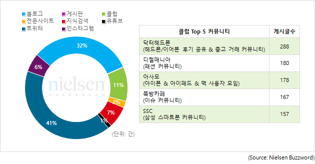 지난 1분기 무선 이어폰 관련 게시글을 가장 많이 생성한 채널은 ‘트위터(41%)’인 것으로 확인됩니다. 트위터에서는 주로 인기 아이돌이 사용하는 특정 제품에 대해 리트윗하거나, 자신의 무선 이어폰 사용 경험담을 이야기하는 게시글이 지속적으로 게재되고 있습니다. 다음으로 많은 비중을 차지한 ‘블로그(32%)’에서는 제품별 스펙과 타 제품 대비 장단점을 상세히 비교한 개봉 후기 및 각종 할인 정보가 주를 이루고 있습니다. 클럽(11%) 중에서는 ‘이어폰/스마트폰 관련 커뮤니티’나 ‘디젤 매니아’, ‘쭉빵카페’와 같이 젊은 층의 이용률이 높은 커뮤니티에서 무선 이어폰 관련 게시글이 다수 발생했습니다.