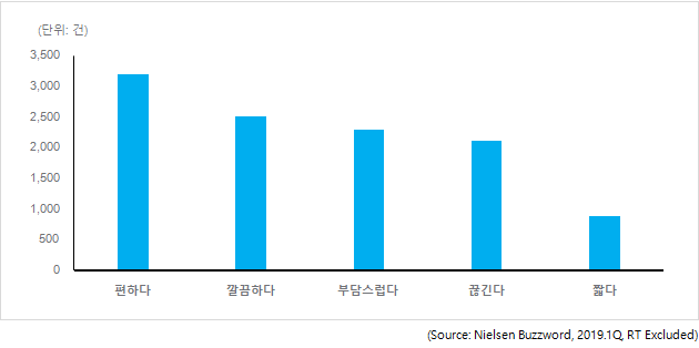2019년 1분기에 무선 이어폰과 함께 가장 많이 언급된 브랜드는 압도적인 차이로 에어팟을 출시한 애플이 차지했습니다. 특히 에어팟 2세대의 국내 출시일에 대한 문의가 쏟아지고, 1세대 제품과 비교해 개선된 스펙을 공유하는 게시글이 주를 이뤘으며, 충전기 케이스에 각인을 새기거나 키링을 다는 등 에어팟 악세서리 관련 게시글도 끊임없이 생성되고 있습니다. 다음으로 삼성전자가 ‘갤럭시 버즈(Galaxy Buds)’의 영향으로 많이 언급됐으며, 에어팟과 스펙을 비교하는 게시글이 다수 발생했습니다. 뒤이어 QCY에서 출시한 T1 제품은 가성비 면에서 호평을 받고 있습니다.