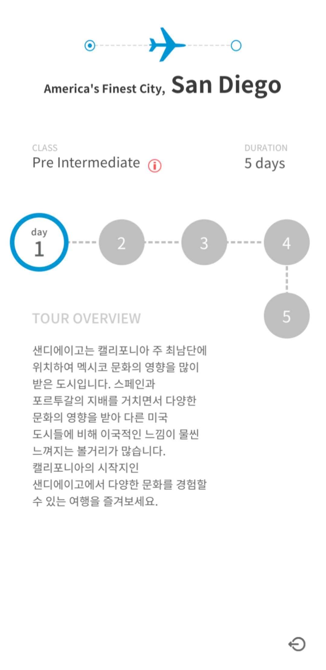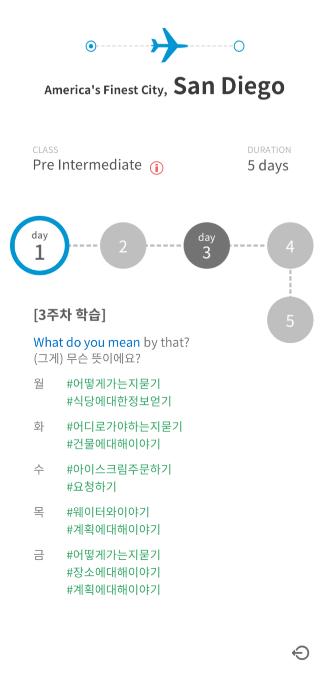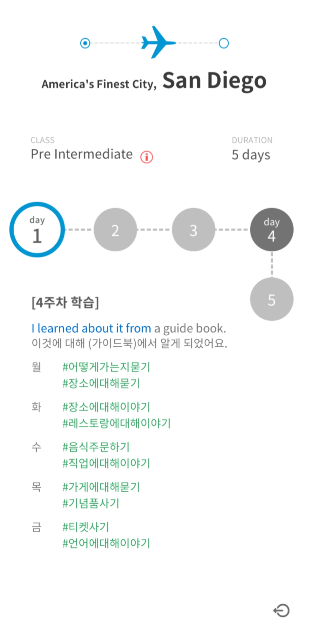 저는 미국의 SAN DIEGO를 선택했는데요. 1일부터 5일차 까지 주제를 선택해서 영어회화를 해볼 수 있습니다.