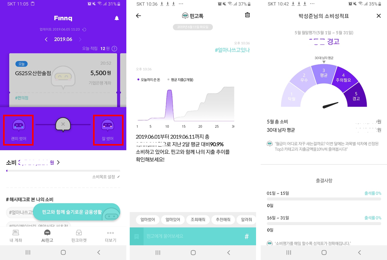 AI핀고는 카드/계좌 내역을 불러올 수 있도록 셋팅해두엇을 경우, 자신의 수입/지출 현황을 이해하기 쉽게 분석해준다. 수입과 지출 현황을 보고 어제와 오늘 사용한 지출 금액에 대해 "괜히 썻어" 또는 "잘 썻어"로 분류하여 자신의 소비 습관을 점검할 수 있어 지출관리에 용이하다. 여기서 1일 최대 20원까지 핀크머니가 적립된다.