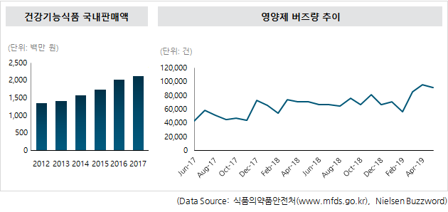식품의약품안전처가 공개한 통계 자료를 보면 건강기능식품의 국내판매액은 매년 성장하고 있습니다. 소비자들은 건강기능식품이라는 산업군 명칭보다는 영양제, 홍삼 같은 키워드를 더 많이 사용하는데요, 건강기능식품 중 영양제의 버즈량 추이를 보면 최근 2년간 꾸준히 증가세를 보이고 있습니다. 과중한 사회적 부담으로 인한 피로감과 스트레스, 운동, 피부관리 등 건강과 이너뷰티에 대한 관심 증대, 불규칙하고 영양 불균형적인 식습관 등으로 인해 자신에게 부족한 영양소를 직접 챙기는 ‘셀프 메디케이션(Self-medication)’이 하나의 트렌드가 된 것으로 보입니다.