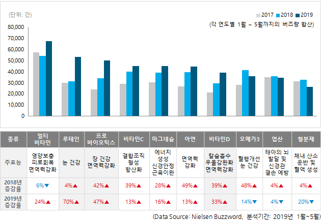 2019년 5월까지의 영양제 컨텐츠의 연관어를 분석해 보면, 최근 사람들이 주목하는 영양제의 효능은 무엇인지, 어떤 기대를 갖고 영양제를 섭취하는지 섭취 목적을 파악할 수 있습니다. 가장 많이 언급된 키워드를 보면 면역력(76,518번) 강화와 피로(73,250번) 개선에 대한 니즈가 높은 것을 볼 수 있습니다. 과로, 스트레스, 불균형적인 식습관과 외부 활동량의 감소, 환경오염 등으로 인한 면역력 저하를 걱정하는 사람들이 많습니다. 또한 젊은 세대 중에 육체 및 신체 피로, 과도한 스마트폰 사용으로 인한 눈의 피로 등을 호소하는 경우도 늘어나고 있습니다. 신체 발육, 뼈 및 관절 건강에 필수적인 칼슘(61,591번) 흡수를 돕는 영양제에 대한 관심도 높습니다.