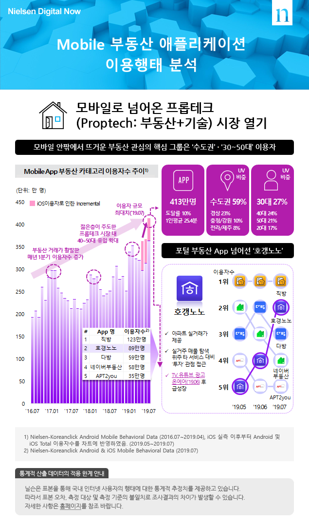 오늘날 부동산시장의 정보제공은 편의성의 장점을 기준으로 매우 빠르게 변화되었다. Mobile 부동산 서비스에서 보자면, 1위 직방, 2위 다방으로 구분되어 왔지만, 최근 닐슨코리아에 2019.08.22일 발표에 따르면 매우 다르게 변화되는 시장을 볼 수 있다. 부동산과 기술의 시장 열기가 뜨거우며, 모바일로 넘어온 프롭테크시장이라고 표현 한다.