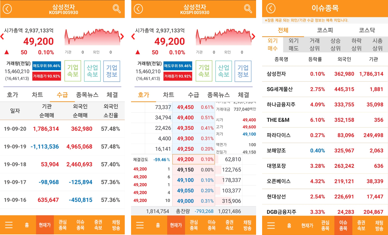적은 돈이라 할지라도, 재태크는 꽤 신중하게 선택해야 하는 요소 입니다. 현재 실시간 시세도 가능하고, 매수, 매도가, 외국인의 매도, 매수, 거래량의 상위 종목까지 꽤 직관적인 UI를 구성하고 있습니다. 하단에는 총 6개의 메뉴가 존재합니다.
