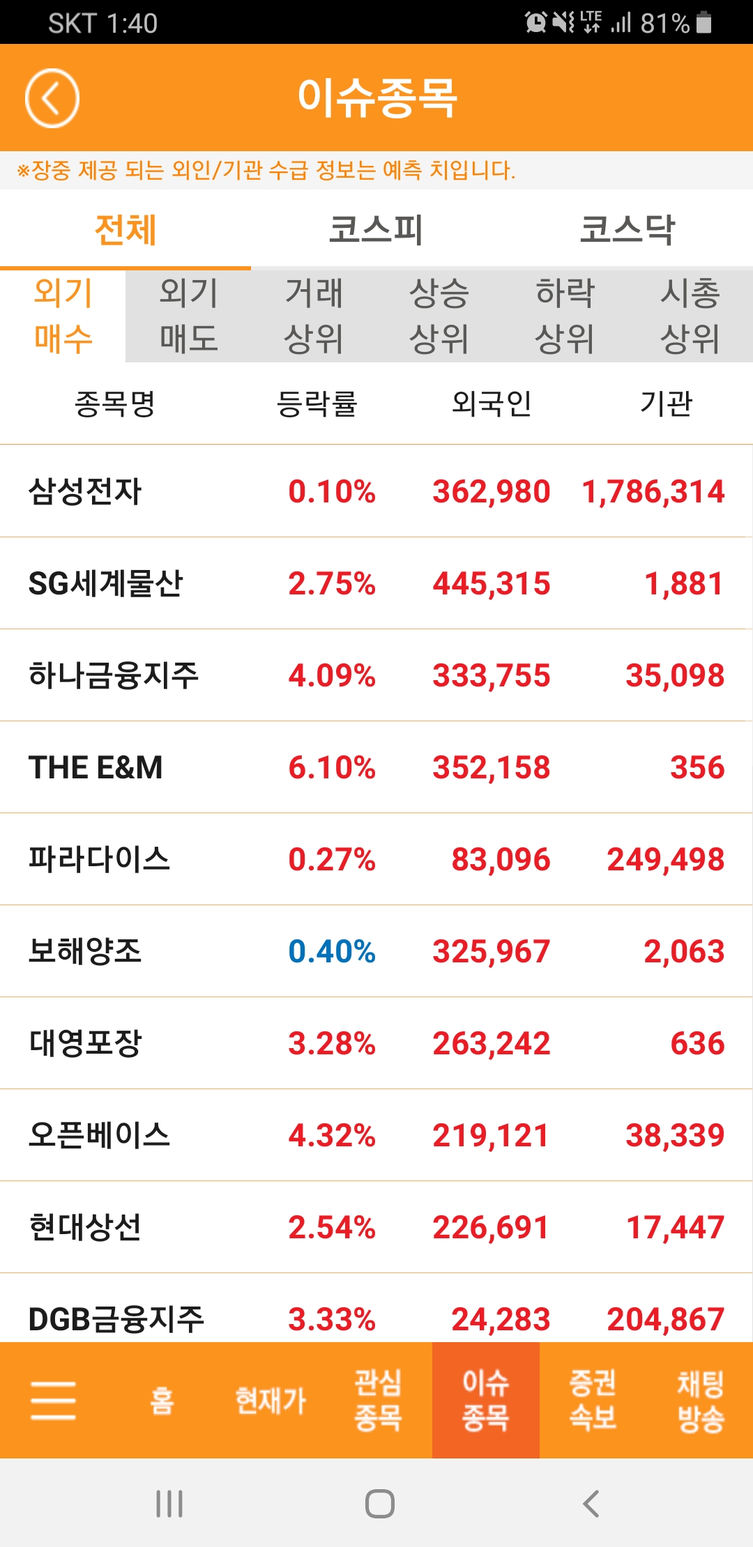 이슈종목을 따로 구분해서 정리해 주고 있는데요. 기관과 외국인등이 보유 및 구매하고 있는 코스피, 코스닥 종목을 순위로 확인할 수 있습니다. 이부분은 주식 거래시 유용한 정보라고 판단할 수 있는데요.