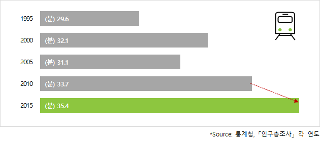교통은 도시를 구성하는 중요한 기능 중 하나로써, 경제활동을 영위하는 근로자들에게 통근시간은 필수적으로 소비되는 시간입니다. 그러나 도시가 팽창하는 과정에서 교통의 발달과 지가 상승 등이 도시 전반의 직주근접성에 영향을 미치며, 평균 통근시간 증가로 인해 시민들의 삶의 질이 저하되고 있습니다. 통계청에서 시행한 ‘인구총조사’ 자료에 따르면, 2015년 국내 평균 통근시간은 35.4분으로, 지난 2010년 조사 대비 1.7분 증가했습니다. 특히 서울/수도권의 통근 소요시간은 전국 평균을 상회하며, 교통 문제에 대한 민감도가 높게 형성된 것으로 보입니다.