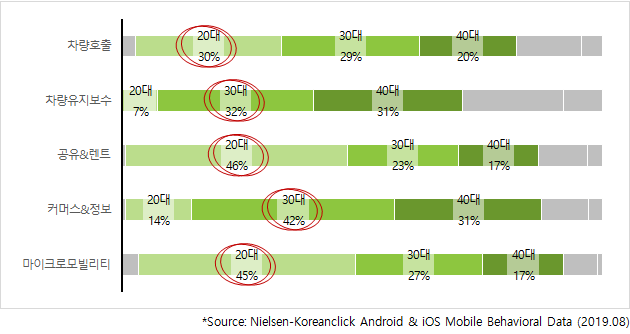 먼모빌리티 Mobile App 서비스 내 정의된 5개의 유형은 이용자의 연령대별 분포에 따라 20-30대 중심의 ‘차량호출’, ‘공유&렌트’, ‘마이크로모빌리티’와, 30-40대 중심의 ‘차량유지보수’, ‘커머스&정보’로 양분되었습니다. 특히 ‘공유&렌트’와 ‘마이크로모빌리티’ 전체 이용자 중 20대가 차지하는 비중은 각각 46%, 45%로 조사되었는데, 이는 30-40대 대비 구매력이 낮아 자차를 보유하지 않은 20대가 저렴한 비용으로 쉽게 접근할 수 있는 서비스로 이용 수요가 집중적으로 발현된 데에서 기인한 것으로 보입니다. 또한 자차 보유자 비중이 20대 대비 높은 30-40대는 세차, 충전, 주유, 수리, 중고매매 등 자차를 중심으로 한 서비스 내 이용자 비중이 가장 높은 것으로 조사되었습니다.