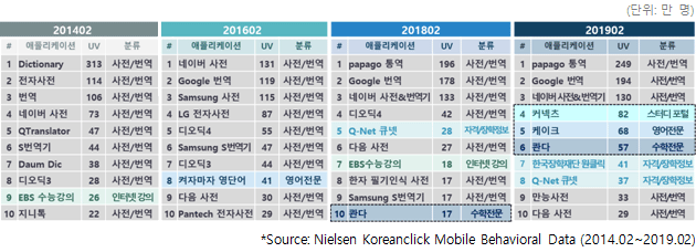 실제로 교육 관련 애플리케이션 이용자수 TOP10 랭킹을 살펴보면, 과거에는 대부분이 사전/번역 애플리케이션으로, 필요 시에만 애플리케이션을 실행하여 원하는 정보를 검색하는 용도로 제한되어 있었음을 알 수 있습니다. 하지만 최근에는 다각화된 학습 니즈를 포착하여 전문적으로 학습에 필요한 콘텐츠 및 정보를 제공하는 애플리케이션이 다수 출시되며, 이용자수 증가를 견인한 것으로 분석됩니다.