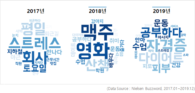 업무 환경의 변화는 퇴근과 관련되어 나누는 주제의 변화에도 영향을 끼쳤습니다. 지난 3년간 사람들이 퇴근과 관련하여 나누는 이야기의 관련 주제를 살펴보면 2017년에는 퇴근과 관련하여 일상적인 회사 생활과 관련된 ‘회사, 평일, 스트레스, 지하철’ 등이 나타났습니다. 2018년에는 보다 여유 있는 생활이 반영된 ‘맥주, 영화, 산책’ 등의 주제가 주로 등장하며 여가에 중점을 두는 생활로 변화하고 있는 것을 보여줍니다. 그리고 2019년에는 여유를 즐기는 단순 여가에서 벗어나 ‘자격증, 공부, 건강’등과 같이 자기 계발 또는 건강 관리와 관련된 표현이 주로 언급되어 퇴근 후 여가 시간이 증가함에 따라 이를 효율적으로 사용하고자 하는 직장인이 늘어나고 있음을 보여줍니다.