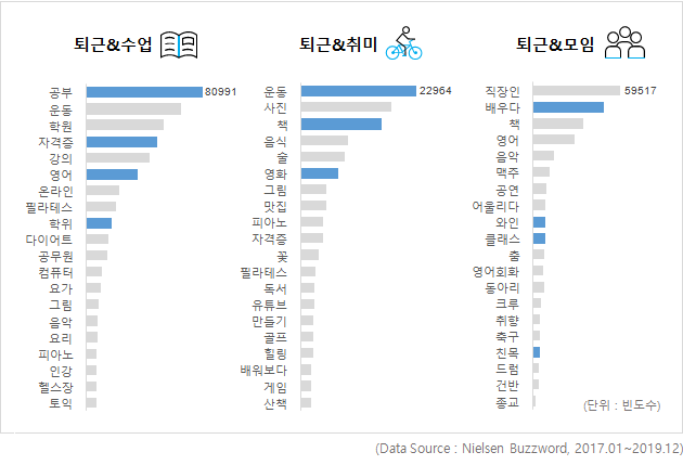 사람들이 퇴근 후 즐기는 활동과 관련하여 2019년 하반기 동안 이야기한 주요 화제들에 대해 조금 더 자세히 살펴보겠습니다. 연관어로 언급되는 ‘공부’, ‘취미’, ‘모임’의 주제와 ‘퇴근’이 동시 언급된 게시글들에서 자주 등장하는 표현들을 살펴보았습니다. ‘수업’ 카테고리에서 많이 언급된 주제들로는 ‘공부’가 가장 많았으며 다른 연관어 중 ‘자격증’, ‘영어’, ‘학위’ 등의 내용이 나타났습니다. ‘취미’ 카테고리에서는 주로 ‘운동’이 언급되었으며 이외에도 ‘책’, ‘영화’, ‘피아노’와 같이 많은 사람들이 즐기는 취미활동에 대한 표현도 보였습니다. 그리고 ‘모임’ 카테고리에서도 취미나 취향에 따라 함께 배우는 ‘원데이 클래스’의 성격이나 좋아하는 것을 다른사람들과 함께 공유할 수 있는 동호회, 동아리 같은 친목 도모의 목적과 관련된 모임 연관어들이 등장하였습니다.