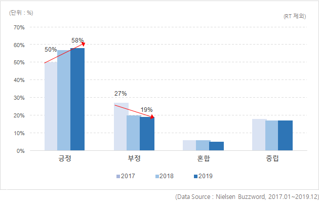 퇴근 후 여가 생활과 관련하여 감성분석을 통해 사람들의 긍/부정 반응도 확인해보았습니다. 2017년에는 50% 정도의 긍정 비중이 2019년이 되면서 58%로 +8%P 증가하였고, 부정의 비중에서는 2017년 27%에서 2019년 19%로 -8%P 감소하였습니다. 이러한 감성 반응의 변화는 퇴근 후 본인이 배워보고 싶었던 취미생활을 즐기면서 스트레스도 풀리고 자기관리도 할 수 있다는 만족감이 직장인들에게 긍정적인 감정을 불러 일으키고 그 영향으로 자기 계발 중심의 퇴근 후 시간을 소비하는 문화가 확산될 수 있었던 것으로 보입니다.