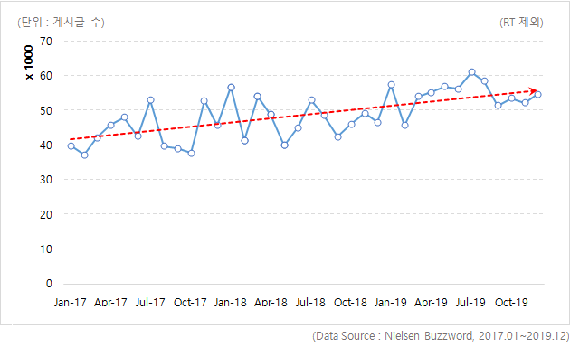퇴근과 관련하여 취미나 여가와 같이 자신을 위한 시간에 대해 관심이 커지고 있는 것은 버즈량의 변화에서도 확인할 수 있습니다. ‘퇴근’과 ‘취미’나 ‘여가’, ‘모임’을 동시 언급하는 게시글 수의 추이를 살펴보면 2017년부터 2019년 12월 현재까지 소셜미디어 게시글 수가 꾸준하게 상승하는 것을 볼 수 있습니다. 퇴근 후 즐길 수 있는 다양한 취미나 활동에 대한 후기와 추천, 그리고 새롭게 취미 활동을 시작해보기 위해 문의를 남기는 게시글 등의 증가가 버즈량 증가를 견인한 것으로 보입니다.