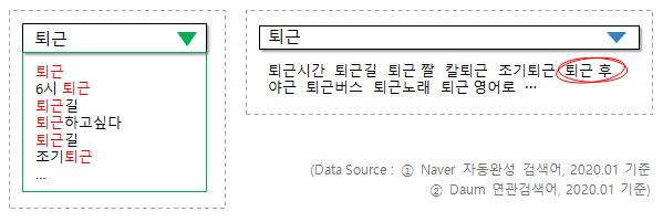 먼저 국내 주요 포털사이트에서 ‘퇴근’과 관련한 자동완성 검색어와 연관검색어를 살펴보면 ‘6시 퇴근’, ‘칼퇴근’, ‘퇴근 후’ 등의 검색어가 등장합니다. 이는 퇴근에 대한 직장인들의 갈망과 함께 퇴근 후 활동에 대한 계획, 기대감 및 관심이 반영된 것으로 추측할 수 있습니다.