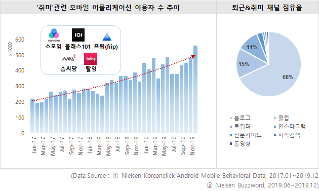 먼저 ‘취미’와 관련하여 안드로이드 기준 다운로드 수가 10만 건이 넘는 원데이클래스/모임 컨텐츠의 대표 모바일 어플리케이션 중 5개를 선정하여 합산 이용자 수 추이를 살펴보면 2017년 1월부터 꾸준히 증가하고 있는 모습이 나타납니다. 시간과 비용을 비교적 크게 들이지 않고도 손쉽게 다양한 취미생활이나 모임등을 검색하거나, 또는 클래스 수강등을 쉽게 참여할 수 있다는 점이 취미 및 클래스 관련 어플리케이션이 성장하고 있는 이유 중 하나로 손꼽을 수 있습니다. 또한 사람들이 ‘퇴근 후 취미’에 대해 이야기하는 채널 점유율에서는 블로그의 비중이 가장 크며 클럽, 트위터 채널의 순서로 나타났습니다. 블로그에서는 직장인들이 참여할 수 있는 취미 모임이나 배울 수 있는 곳에 대한 추천과 정보를 나누는 내용들이 많이 언급되었고, 그 밖에 유튜브 채널에서는 퇴근 후 뭐할까와 같은 직장인의 퇴근하고 난 뒤 저녁 집밥 만드는 요리 영상이나 취미 활동을 담은 일상 브이로그 등이 많이 이야기되는 것을 볼 수 있었습니다.