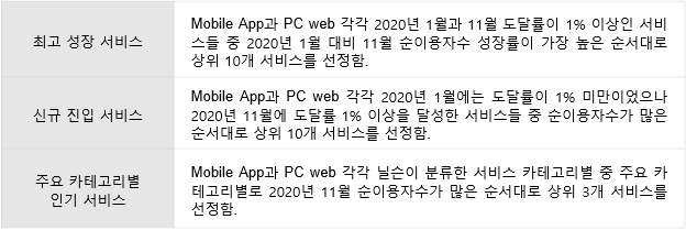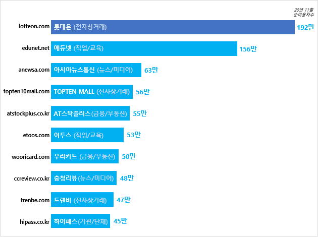 ‘롯데온’은 롯데가 이커머스 시장에서의 외연 확대를 위해 롯데그룹 7개 계열사 사이트를 한데 모아 출시한 온라인 쇼핑 통합 플랫폼으로, 기존에 롯데가 보유했던 사이트들의 트래픽을 흡수하며 2020년 PC web 신규 진입 서비스 중 가장 많은 이용자인 192만명을 확보하였습니다. 또한 코로나 19로 초중고 학생들의 학습 환경이 온라인으로 전환되면서 ‘에듀넷’과 ‘이투스’ 사이트 이용이 늘어나 2020년 11월 각각 156만, 53만명이 사이트를 방문한 것으로 조사되었습니다.