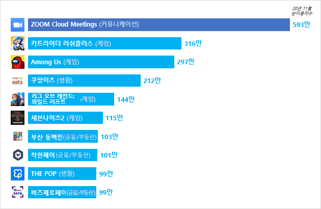 신규 진입 서비스 중 가장 많은 이용자를 확보한 서비스는 ‘Zoom Cloud Meetings’로 올해 코로나로 회사, 학교 등 다양한 분야에서 비대면 접촉에 대한 니즈가 늘어나면서 이용자가 급증해 20년 11월 593만명을 확보하였습니다.