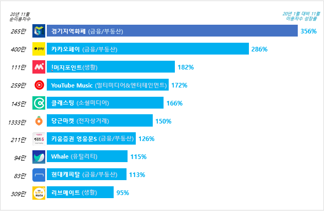 ‘경기지역화폐’ 서비스는 재난지원금 및 소비지원금 등 지자체의 코로나19 대응 경기 활성화 정책과 맞물려 올해 1월 대비 이용자 규모가 356% 급증하면서 성장률 1위를 기록했습니다. 2위인 ‘카카오페이’는 간편 결제 서비스부터 송금, 자산관리, 청구서, 인증 등 다양한 금융 분야로 서비스 영역이 넓어지면서 2020년 이용자가 꾸준히 늘어났으며, 3위인 ‘머지포인트’는 프렌차이즈 음식점들과 편의점, 마트 등 다양한 곳에서 최대 20%까지 할인을 받을 수 있다는 점이 매력으로 작용하면서 30~40대를 중심으로 이용자층이 확대되었습니다.