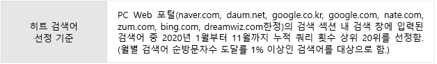 2020년 히트 검색어 선정은 정량적인 평가로만 진행되었으며, 자세한 선정 기준은 다음과 같습니다.