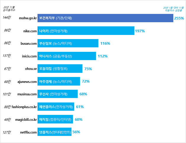 ‘나이키’ 사이트는 11월에 진행된 ‘나이키 에너지위크’ 행사로 많은 소비자들이 PC를 통해 제품 탐색 및 구매를 위해 사이트를 방문하면서 이용자가 급증하였습니다. ‘오늘의집’은 코로나19로 가정 내 거주하는 시간이 늘어나면서 집 꾸미기에 대한 관심이 높아진 영향으로 사이트 방문이 늘어난 것으로 추정되며, ‘무신사’와 ‘패션플러스’도 코로나19로 오프라인 대신 온라인 쇼핑을 통해 옷을 탐색하고 구매하는 소비자가 늘어나면서 이용자가 전년 동월 대비 60% 이상 늘어난 것으로 분석됩니다.