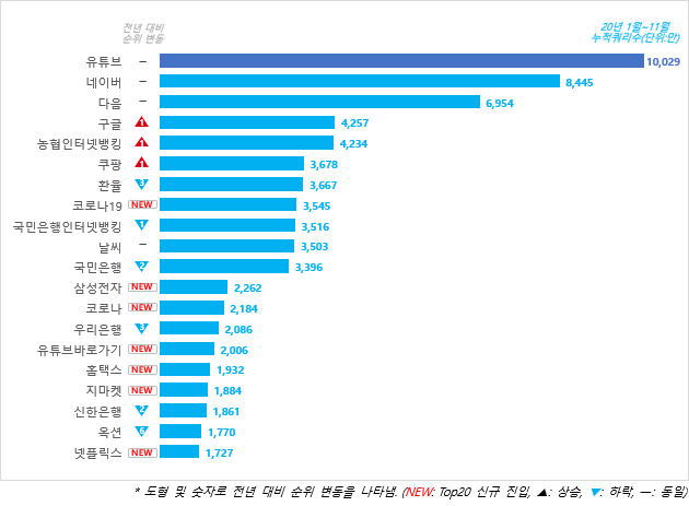 국내 주요 사이트들인 ‘유튜브’, ‘네이버’, ‘다음’ 검색어는 여전히 해당 사이트를 찾아가기 위한 네비게이션 키워드로 많이 검색되며 전년과 동일하게 1~3위를 지켰으나, 전년 4위였던 ‘환율’은 코로나19로 인해 해외여행이 어려워짐에 따라 검색 빈도가 낮아지면서 7위로 내려갔습니다. 코로나19 사태로 인한 외국인의 주식 매도에 맞서 국내 개인 투자자들이 주식을 매수하면서 주요 매수 대상이었던 ‘삼성전자’에 대한 검색도 늘어나 새롭게 Top20에 진입한 것으로 추정됩니다.