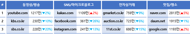 Mobile app과 마찬가지로 PC web에서도 ‘동영상/방송’ 카테고리 서비스 중에서 가장 인기있는 서비스는 ‘유튜브’로 전년 동월 대비 이용자가 2% 소폭 감소했으나 여전히 1200만이 넘는 많은 이용자들이 PC를 통해서도 유튜브를 방문하는 것으로 조사되었습니다.