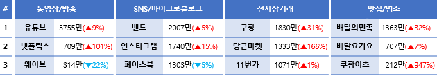 또한 코로나19 장기화로 인한 배달을 통한 외식 증가로 전체 배달앱 시장이 급성장하고 있는 가운데, 공격적인 마케팅과 '한 집 배달'을 통한 빠른 배송을 무기로 내세운 ‘쿠팡이츠’ 이용자가 급격히 늘어나며 200만이 넘는 이용자를 확보하면서 신규 진입 서비스 4위를 기록하였습니다.